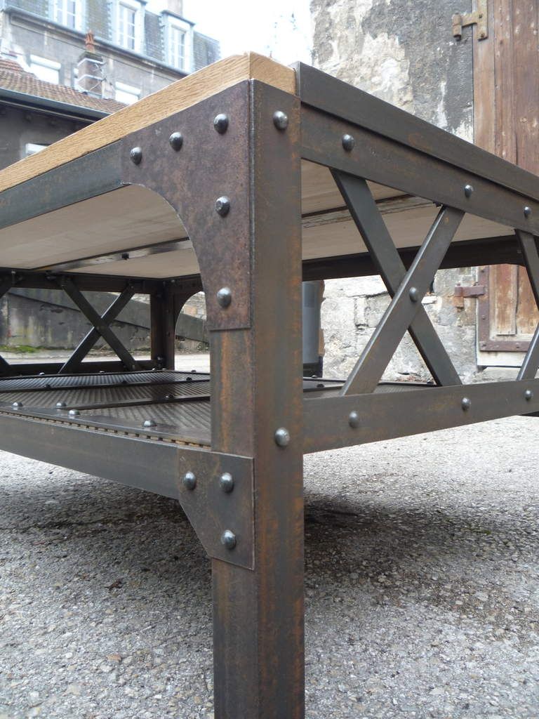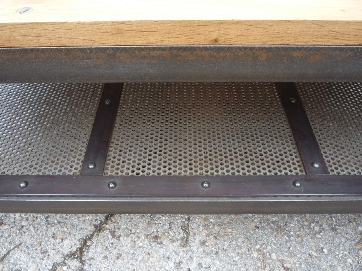 Table basse conçue à partir de 2 poutrelles rivetées façon Eiffel d'un plateau supérieur en chêne massif rustique et un plateau inférieur en tôle ajourée renforcée par fers plats rivetés.